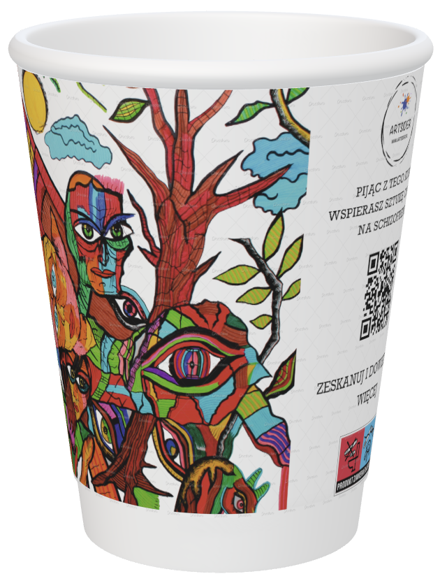 Sprzedajemy papierowe kubki dla kawiarni, ozdobione unikalnymi grafikami osób chorujących na schizofrenię i organizujemy wystawy dzieł