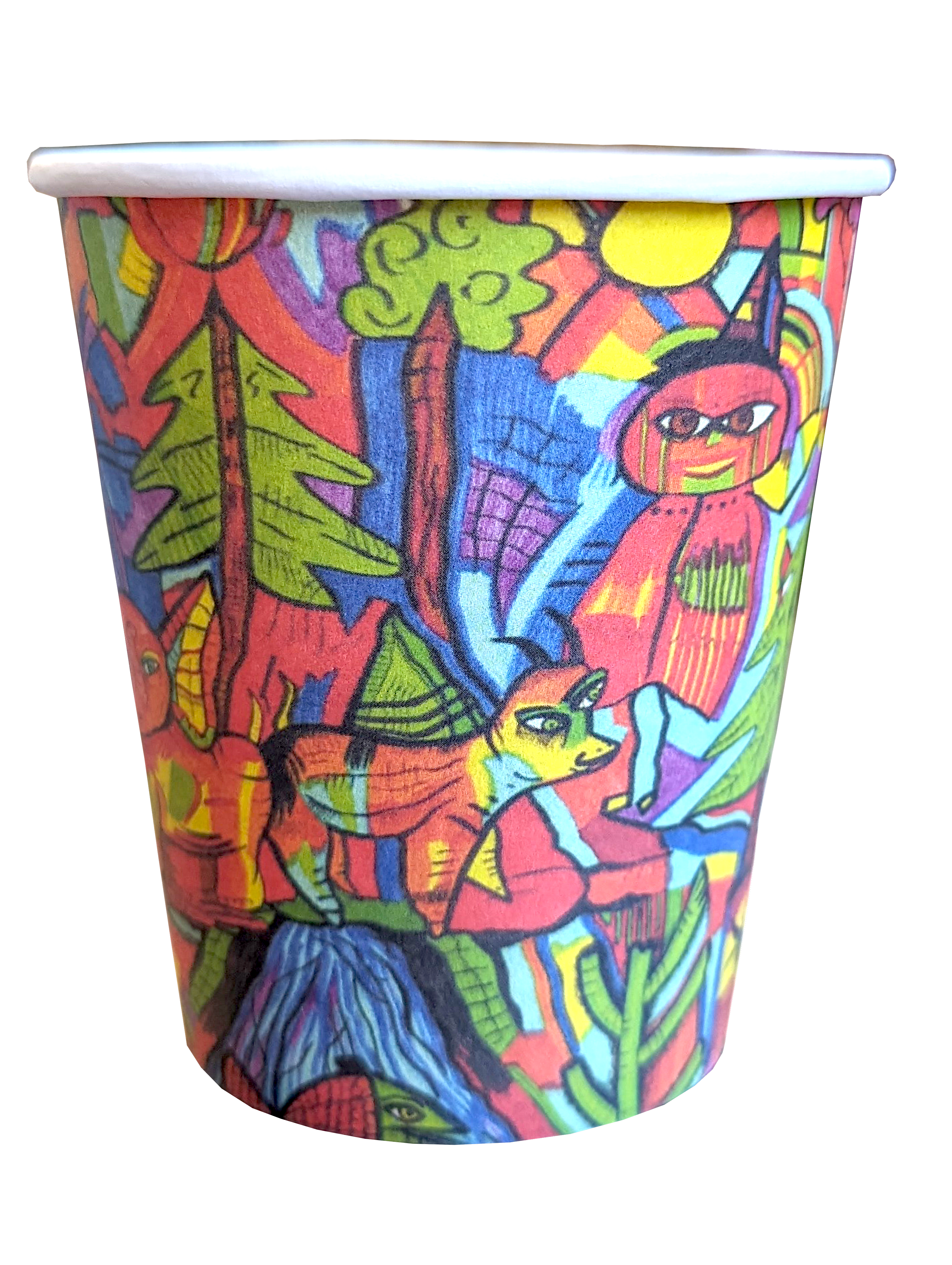 Sprzedajemy papierowe kubki dla kawiarni, ozdobione unikalnymi grafikami osób chorujących na schizofrenię i organizujemy wystawy dzieł