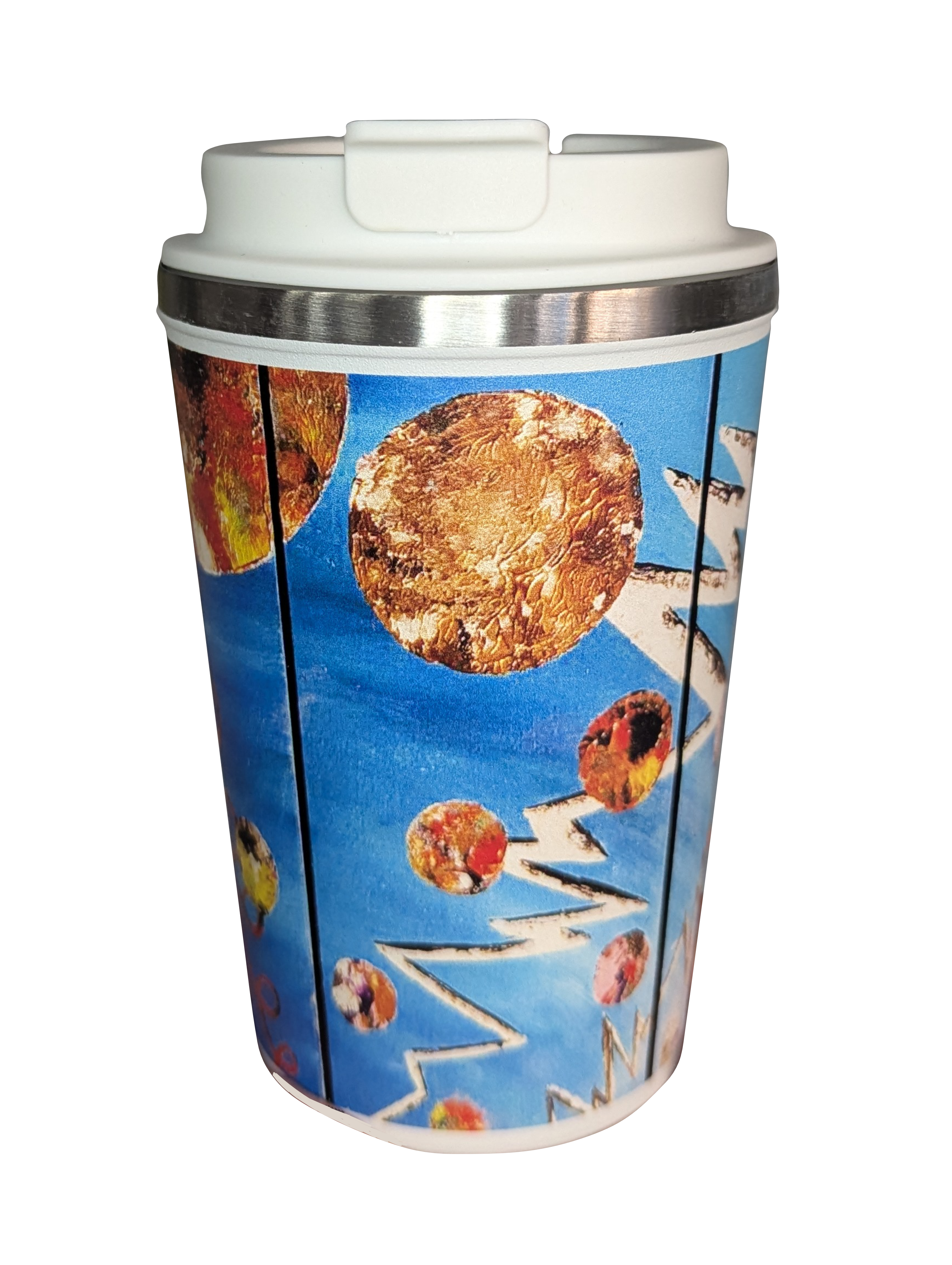Kubek termiczny dwuściankowy o pojemności 350ml z grafiką stworzoną przez Łukasza Adamczyka, artystę chorującego na schizofrenię. Kubek utrzymuje temperaturę ciepłej kawy przez około 7 godzin (po 7 godzinach temperatura od 90 stopni spada do 40 stopni). Jest szczelny i nie kapie nawet po odwróceniu do góry nogami. Wysokość 16.5 cm.