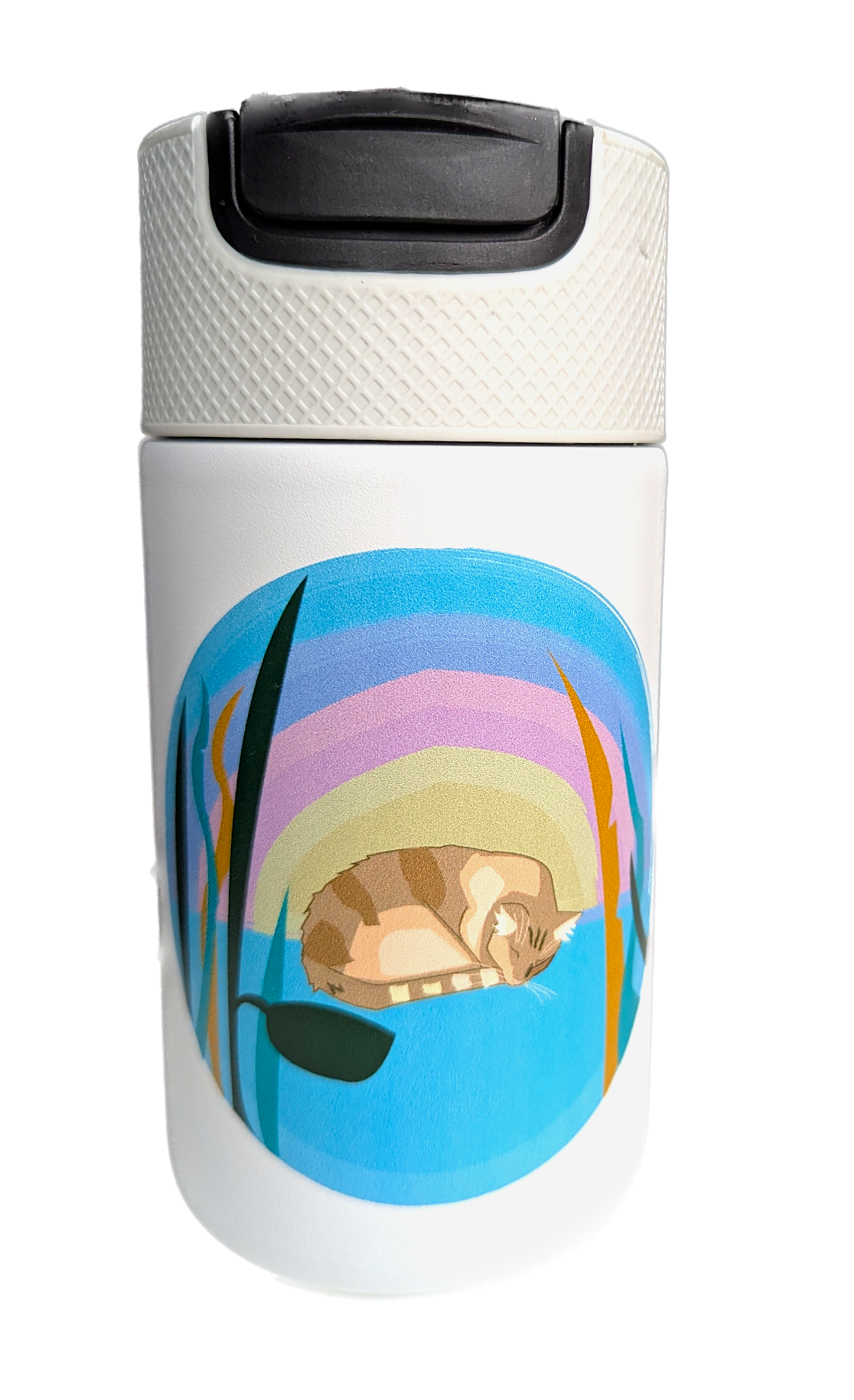 z grafiką stworzoną przez Ewę Zbozień, artystkę chorującą na schizofrenię. Kubek utrzymuje temperaturę ciepłej kawy aż do 8h (po 8h temperatura od 90 stopni spada do 40 stopni). Jest szczelny i nie kapie nawet po odwróceniu do góry nogami. Posiada zabezpieczenie / zamknięcie zapobiegające przypadkowemu otwarciu. Wysokość 16,5 cm, średnica 7,5 cm