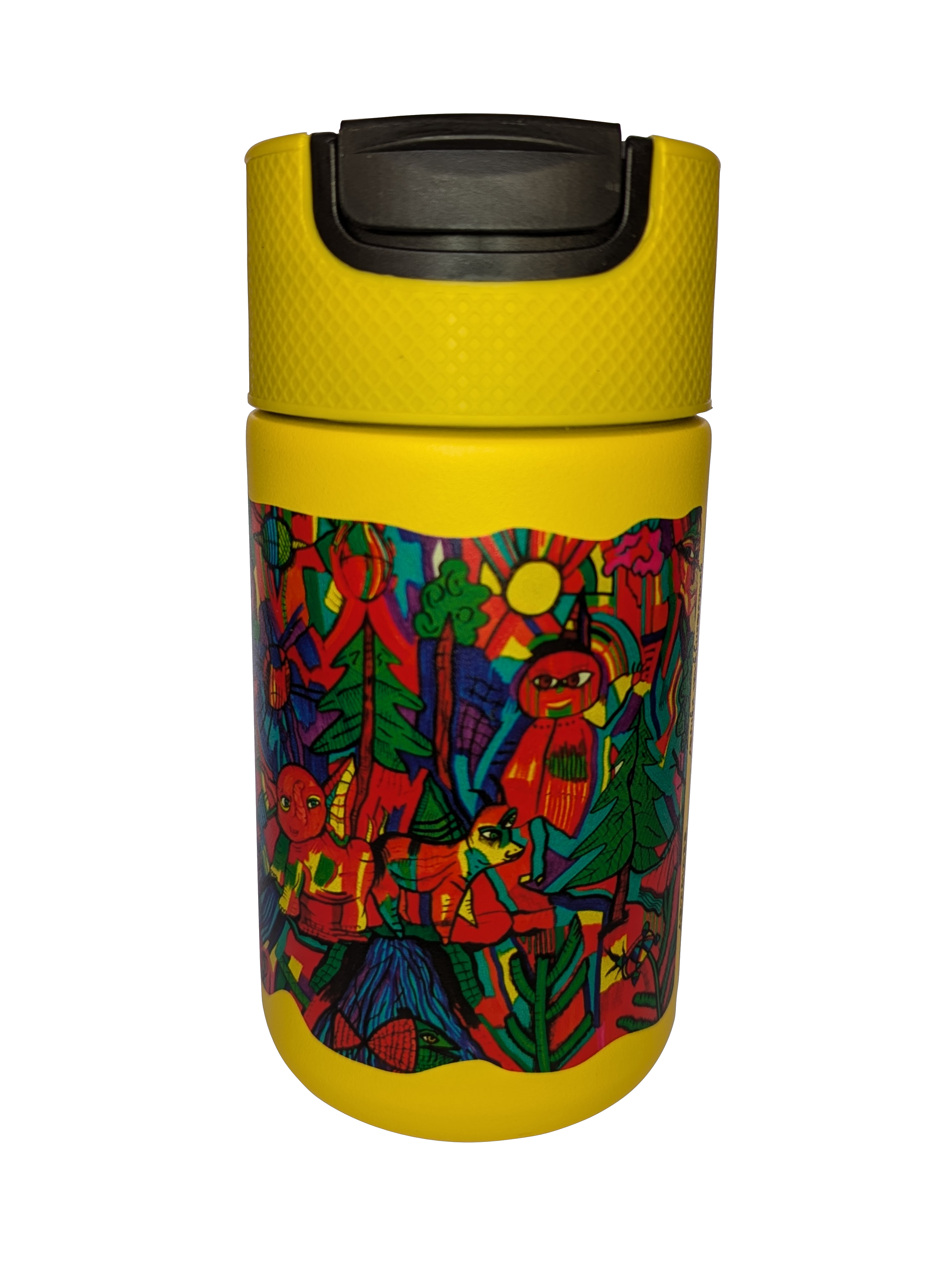 Kubek termiczny dwuściankowy o pojemności 400ml z grafiką stworzoną przez p. Sylwię Mensfeld, artystkę chorującą na schizofrenię. Kubek utrzymuje temperaturę ciepłej kawy przez około 8 godzin (po 8 godzinach temperatura od 90 stopni spada do 40 stopni). Jest szczelny i nie kapie nawet po odwróceniu do góry nogami. Wysokość 16.5 cm.